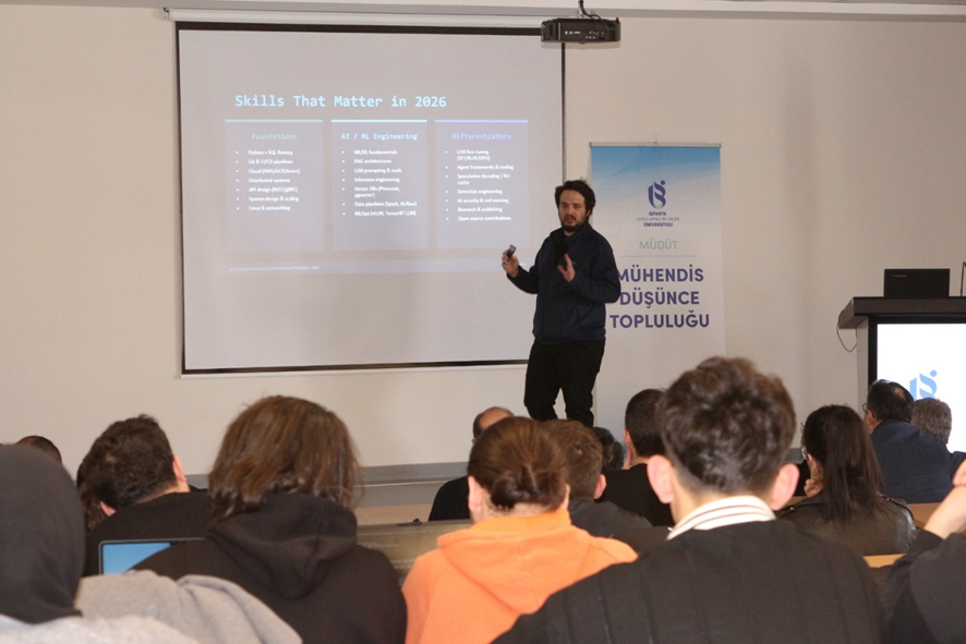 17.03.2026 Salı günü ISUBÜ Mühendis Düşünce Topluluğu organizasyonu ile “2026'da AI Destekli Yazılım Mühendisliği Kariyer Planlaması” adında bir seminer gerçekleştirildi. Davetli konuşmacı Bilgisayar Mühendisi Nebi Mert Aydın tarafından verilen seminerde Yazılım Mühendisliği alanında kariyer planlaması yapmak isteyen katılımcılara yurt dışında sektörel son trendler hakkında bilgiler sunuldu. Son 10 yıldır mesleki kariyerini ABD’de birçok global şirkette farklı projeler ve pozisyonlarda ilerleten ve girişimcilik deneyimleriyle önemli projeler gerçekleştiren Aydın, bu deneyimlerini öğrenciler ve katılımcılar ile paylaştı.