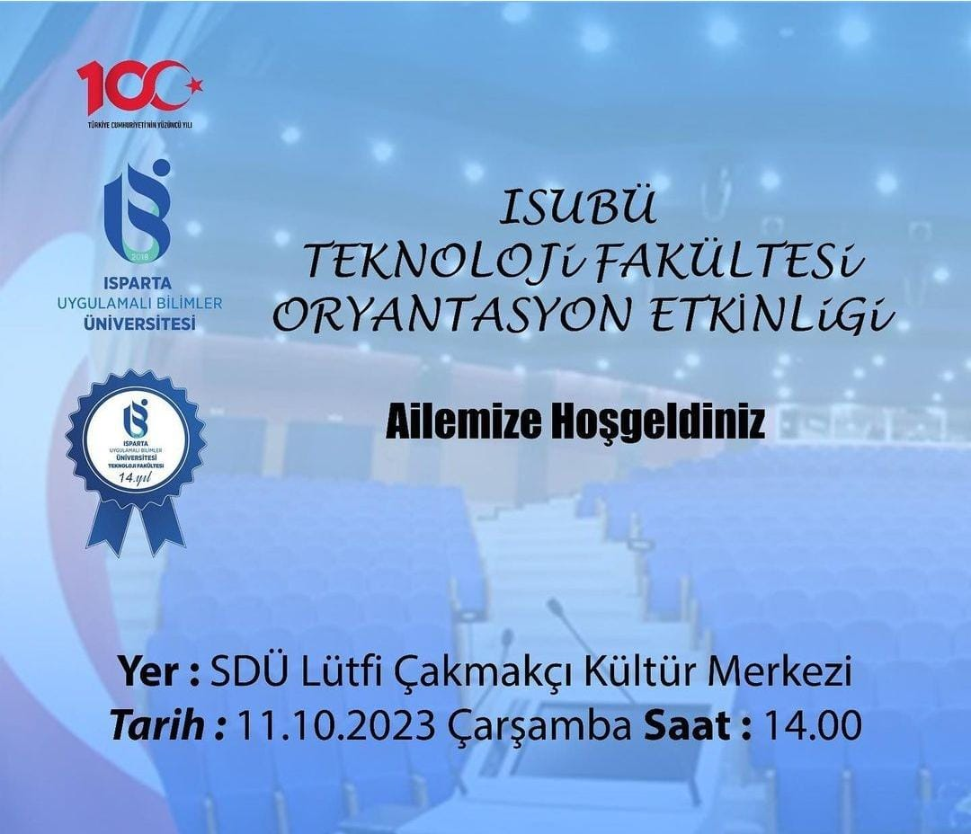 2023-2024 Eğitim-Öğretim Yılı 1. Sınıflar için 11.10.2023 tarihinde fakültemiz tarafından Süleyman Demirel Lütfi Çakmakçı Kültür Merkezinde oryantasyon programı düzenlenecektir. Oryantasyon programı ile ilgili afiş aşağıda verilmiştir.
