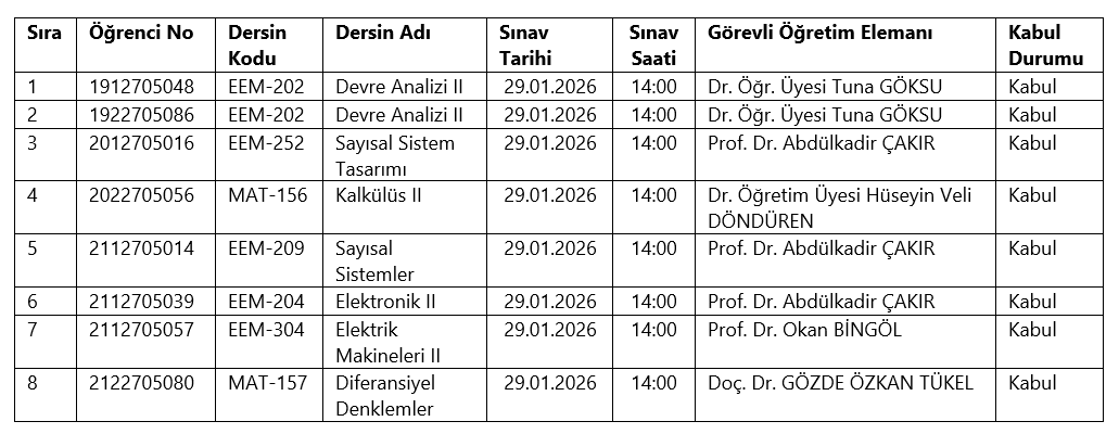 Değerli öğrencilerimiz 2025-2026 Güz Y.Y. tek ders sınavı başvuruları incelenmiştir. Başvuruların kabul durumları ve sınavlara ilişkin bilgiler aşağıdaki tabloda verilmiştir. Tek ders sınavları tabloda belirtilen tarih ve saatlerde Teknoloji Fakültesi 100. Yıl Yerleşkesi 1. Kat 119 numaralı derslikte yapılacaktır. Sınavlarınızda başarılar dileriz.