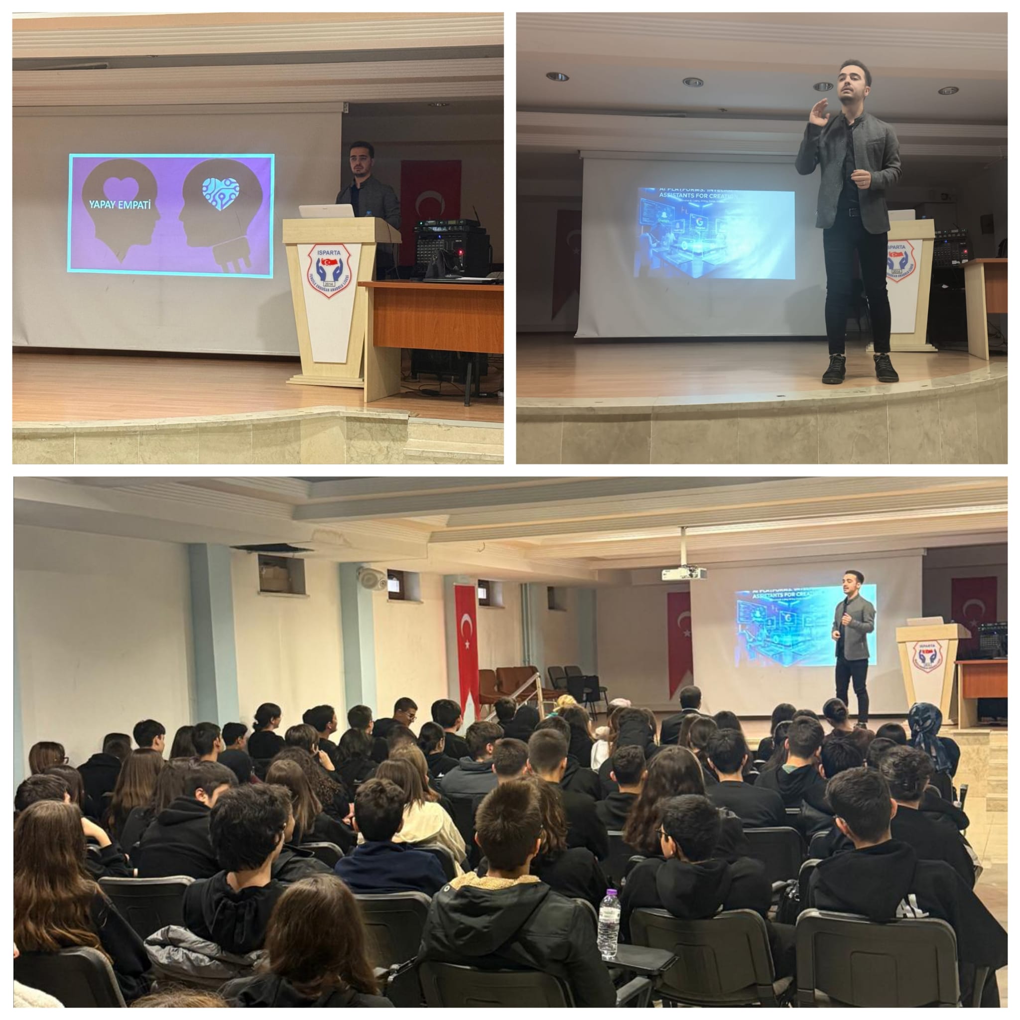 Üniversitemiz Arş Gör. Mehmet YÜCEL tarafından Tenzile Erdoğan Anadolu Lisesi’nde “Yapay Empati ve Dijital Özne” başlıklı bir seminer verilmiştir. Seminerde, yapay zekânın insan duygularını anlama kapasitesi, dijital ortamda bireyin konumu ve teknolojinin etik boyutları üzerine güncel örneklerle bilgilendirmeler yapılmıştır.
